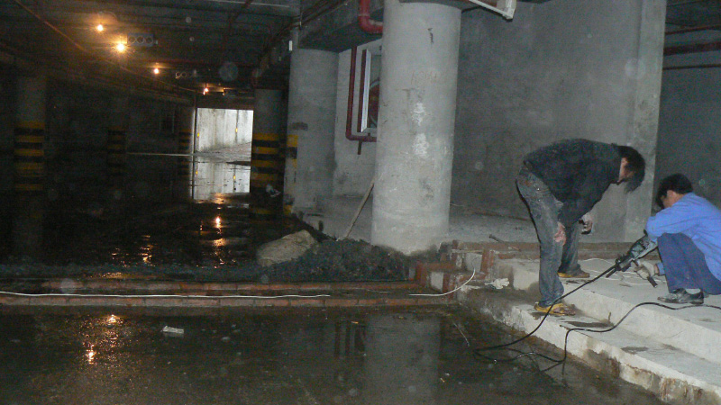 地下車庫使用時間久后,后澆帶有部分滲水現象,且越來越大,泥沙也一起沖出。公司技術人員根據現場勘察情況,經過分析研究,采用“圍堵置換”工藝施工,在漏水點周圍2米處打2.5米深孔注漿,用以圍堵水源,同時把漿液填充到被沖出泥沙原部位,當漿液達到一定濃度時,凝固成膠體,阻斷其它滲水源的進入,同時,漿液在進入滲水區域后膠凝,漏水通道也得到阻塞。經過治理,再無滲漏。